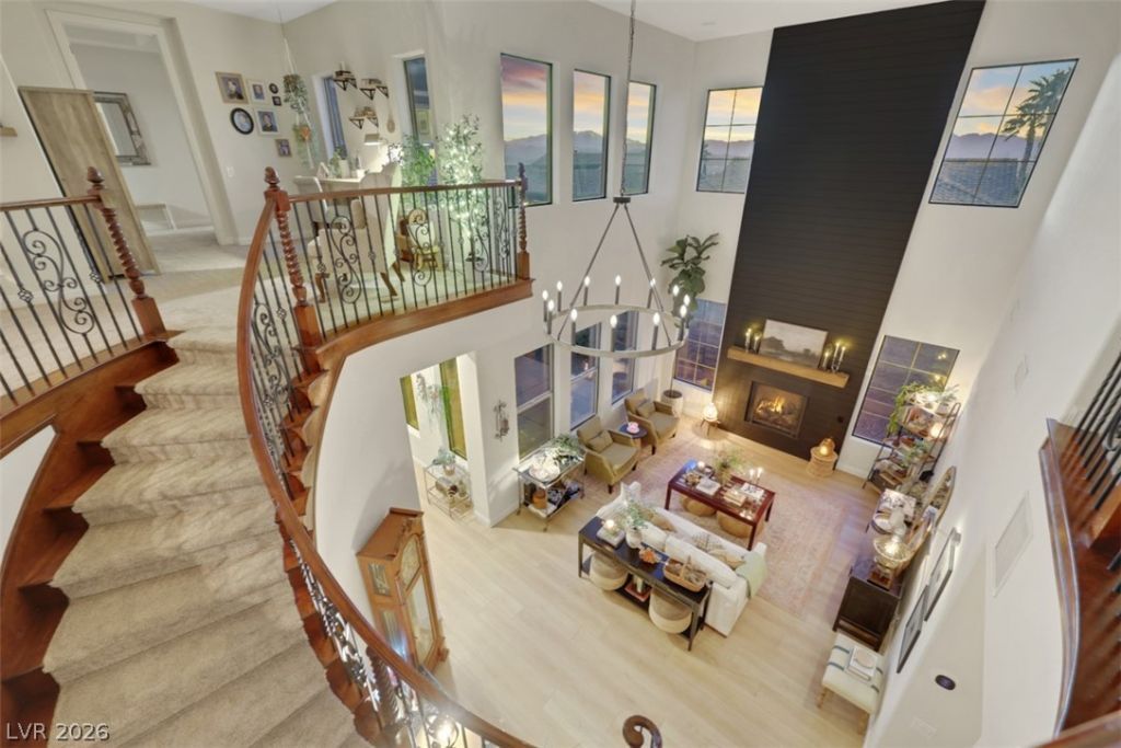 Experience refined living in the prestigious, guard-gated Club at Madeira Canyon. This over 4,800 sq ft, 5-bedroom, 5.5-bath estate, with an office and loft, seamlessly blends mountain tranquility with vibrant city views. The functional layout is designed for comfort and grand entertaining. At the heart of the open-concept space is a designer kitchen, anchored by an 11-ft island, top-tier appliances, and dual ovens, complemented by a butler's pantry flowing into the formal dining room. Dual fireplaces define the living areas; one a striking black floor-ceiling shiplap statement wall, the other a tranquil blend of neutral textures and open shelving. A convenient downstairs guest suite adds flexibility for multigenerational living. The private primary retreat is an elevated sanctuary featuring a spa-like bath, dual closets, and a private view-swept balcony with amazing panoramic views. Delivering over $100K in designer upgrades, this residence offers an unparalleled luxury lifestyle.